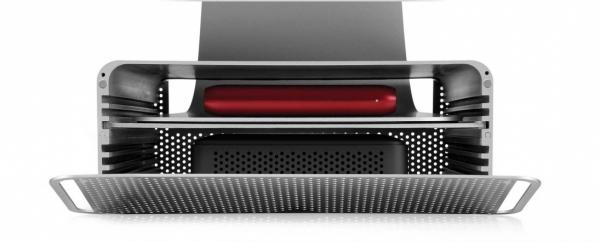 El pie está realizado en metal y tiene un frente con un panel perforado, en su interior incluye un estante regulable en seis posiciones para que puedas guardar los objetos que necesites. Es un espacio secreto y que ahorra espacio en tu escritorio, en el que puedes guardar discos rígidos externos, una Mac Mini, iPod, iPhone, cables, llaves o tu billetera. El frente y el panel posterior se ajustan a través de imanes y ambos están perforados para asegurar una buena ventilación. Para lograr un espacio de guardado más seguro las placas se pueden ajustar a través de tornillos.