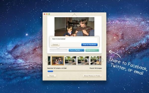 Lost Photos tiene soporte para revisar cuentas de gmail.com, yahoo.com (u otras cuentas de Yahoo de diversos países), me.com, mac.com, aol.com, btinternet.com, charter.net, cox.net, att.net, xtra.co.nz, ymail.com y rocketmail.com. Con un solo clic podrás compartir tus fotografías encontradas a través de Facebook, Twitter o e-mail.